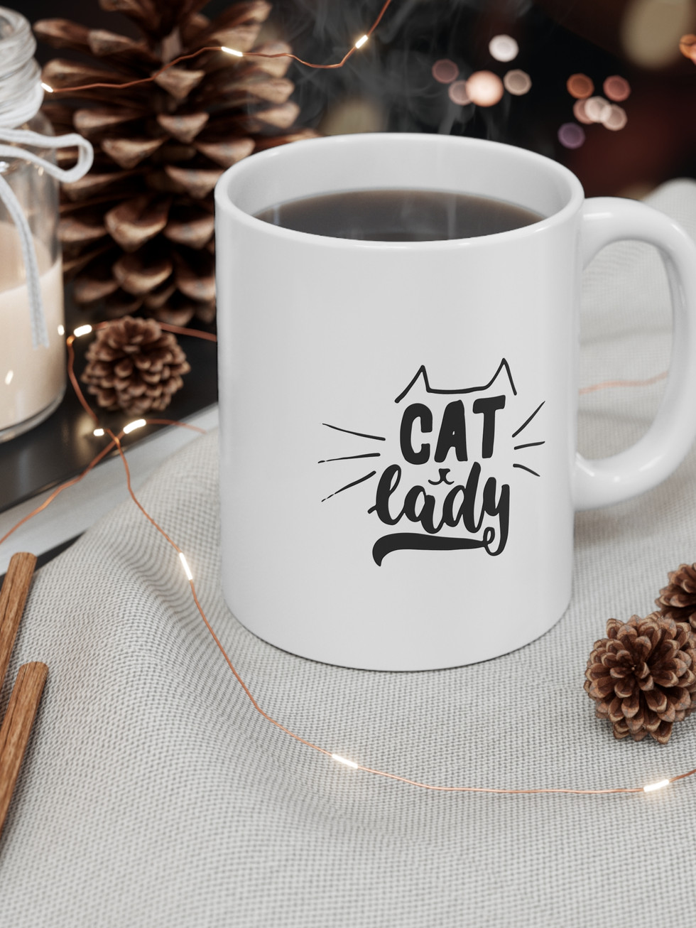 This cat lady mug exudes coziness and warmth, perfect for enjoying a morning cup of coffee or tea. Ideal for cat lovers and makes a great gift for birthdays, Christmas, or any occasion.Product features- 11oz capacity- Safe for microwave and dishwasher- Made of white ceramic- Features rounded corners and a C-handle- Lead and BPA-freeCare instructions- Clean in dishwasher or wash by hand with warm water and dish soap
