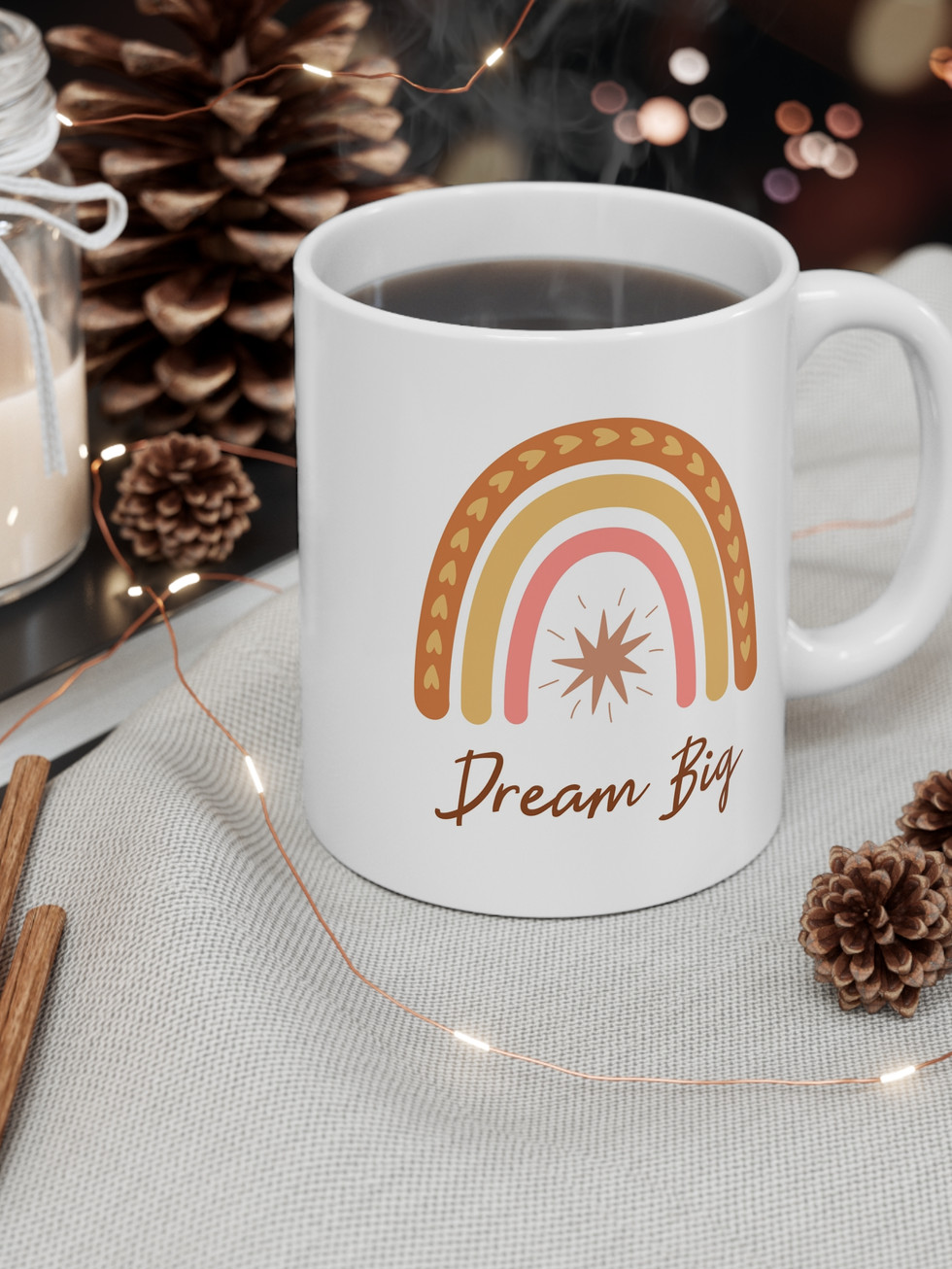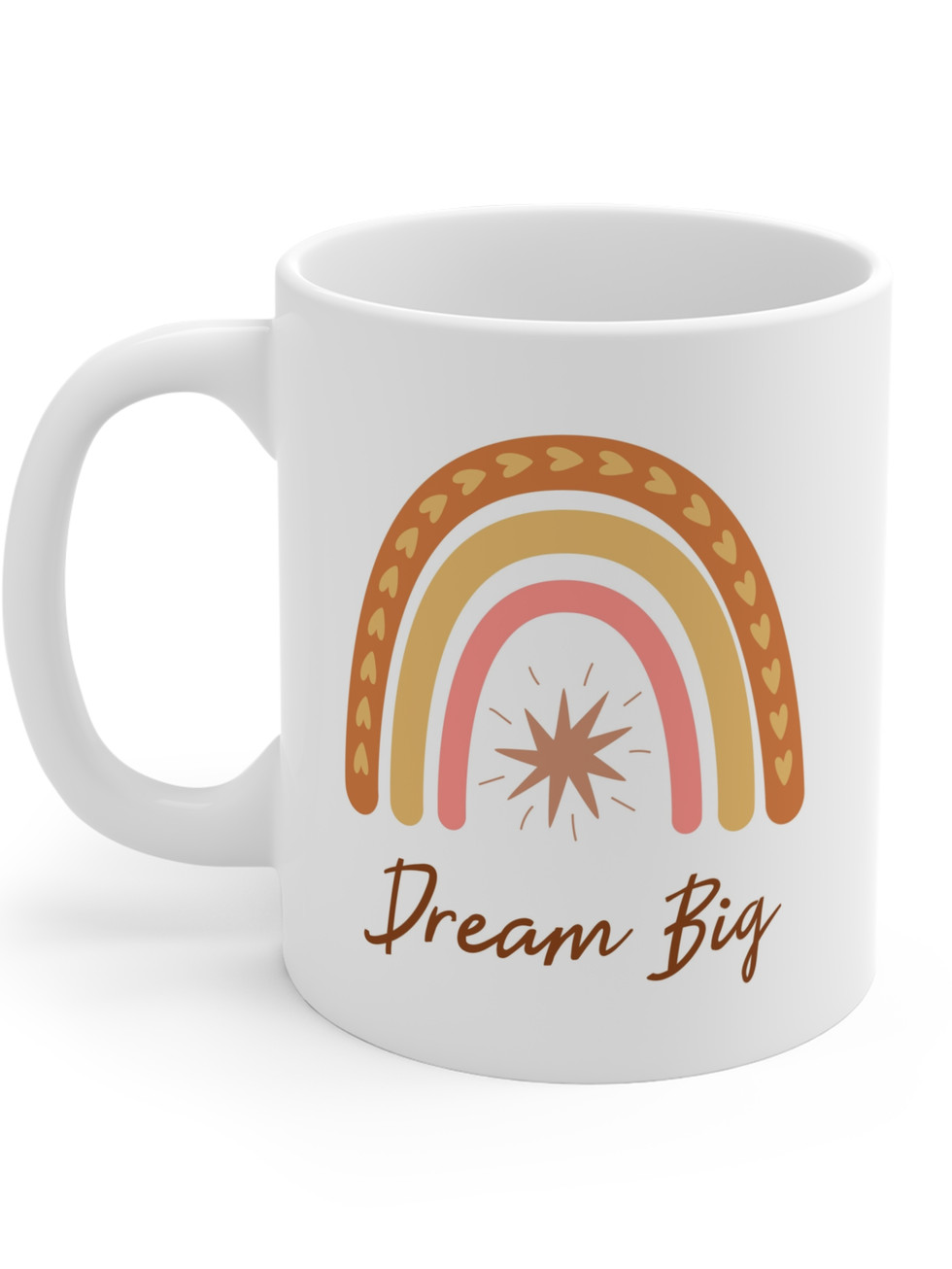 Embrace your aspirations with our "Dream Big" mug, where every sip is a reminder to reach for the stars. This sleek ceramic mug features bold, hand-lettered text that stands out against the clean background, making a statement as powerful as your morning coffee. Perfect for dreamers, doers, and anyone who believes in the power of thinking big, this mug holds 11 ounces of your favorite beverage and doubles as a daily dose of inspiration on your desk or kitchen counter. Microwave and dishwasher safe, it's as practical as it is motivational.Lead and BPA-free.