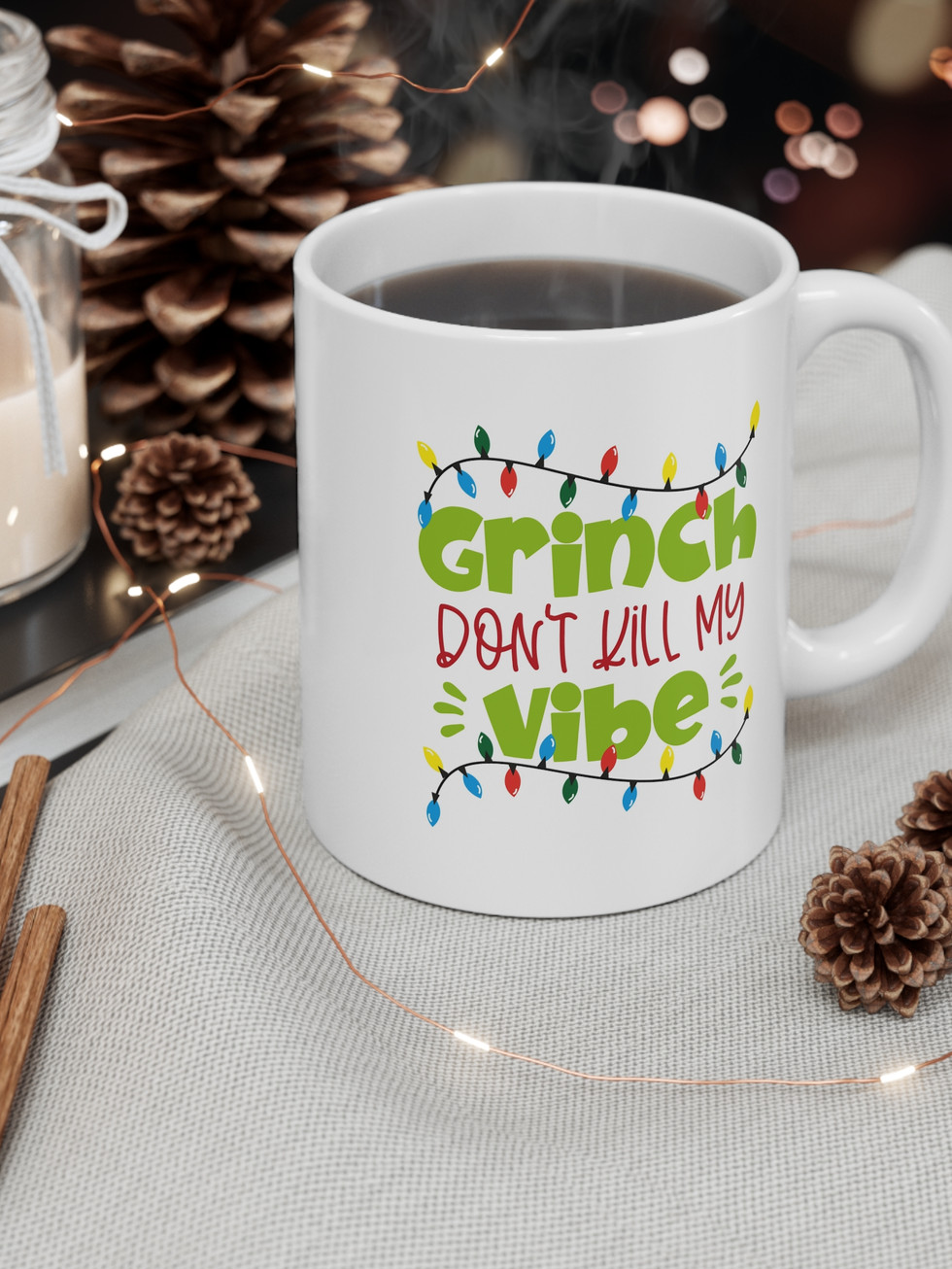This mug with the quote "Grinch don't kill my vibe" is perfect for Christmas enthusiasts who want to add a touch of humor to their morning coffee routine. The chic design exudes a festive and playful atmosphere, making it an ideal gift for friends and family during the holiday season.Product features- 11oz capacity for generous pouring- Safe for use in the microwave- Dishwasher-safe for easy cleaning- Made of white ceramic for a sleek look- Lead and BPA-free for peace of mindCare instructions- Clean in dishwasher or wash by hand with warm water and dish soap